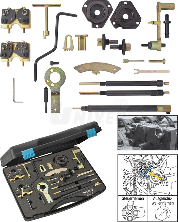 Použití při opravách hlav válců nebo motoru, nebo při výměně rozvodového řemene je tato aretační sada